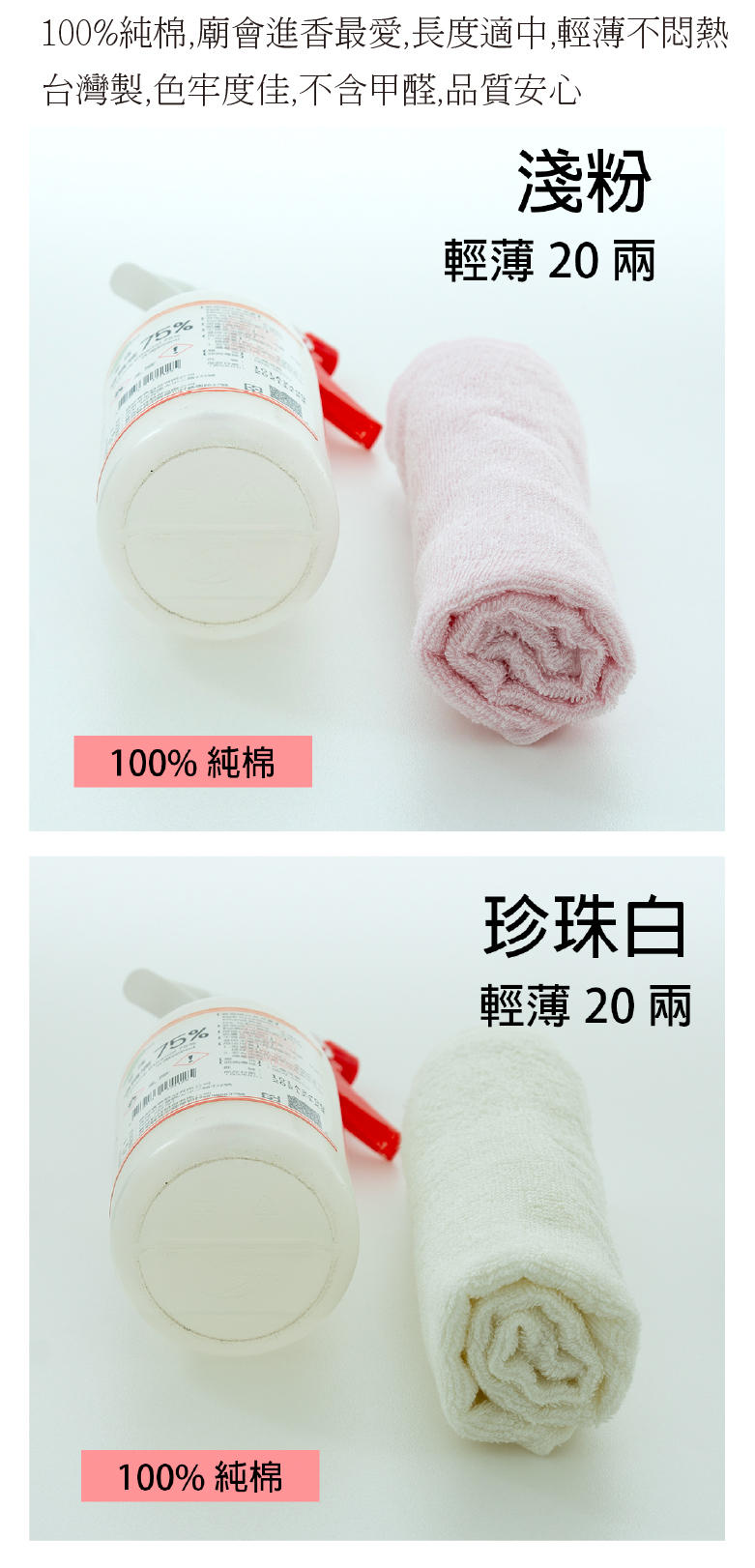 100%純棉,使用原生綿環錠紗,毛巾柔軟耐用,吸水佳 長度適中,輕薄不悶熱,台灣製,色牢度佳,不含甲醛,品質安心 單條重量:62.5公克±5%