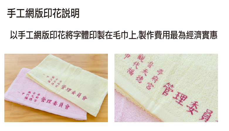 以手工網版印花將字體印製在毛巾上,最適合廟會毛巾客製,製作費用最為經濟